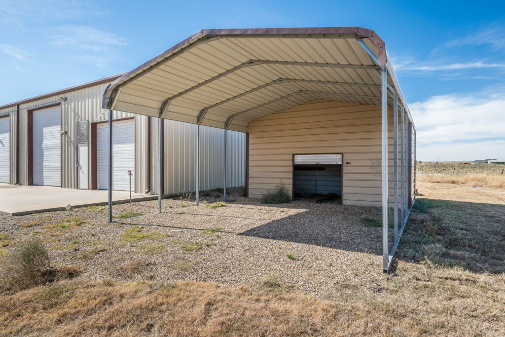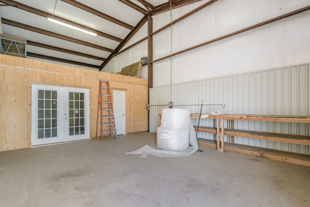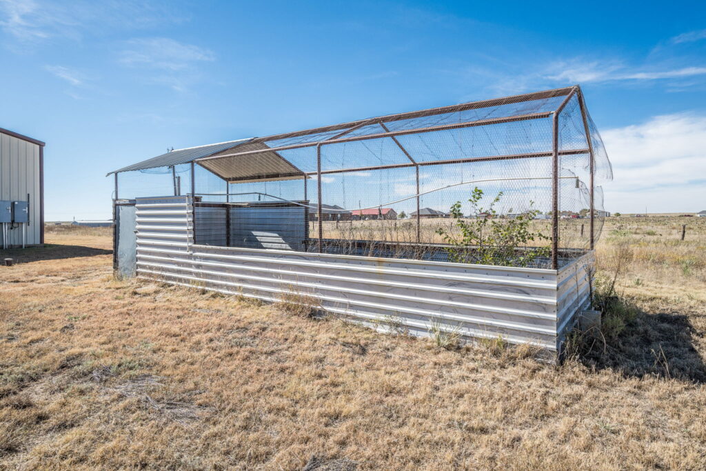 Outside, the amenities continue to impress. A three-car attached garage features a half bath and a secure gun safe/above-ground storm shelter. The 45’ x 80’ metal shop includes a half bath and a 378 sq ft office, plus four overhead doors for easy RV and equipment access. A nearby 10’ x 20’ storage building with a carport offers additional storage space. Let’s not forget your four-legged family members! When they are done exploring the vast property, there is a 40’ x 60’ Priefert dog pen for them to enjoy. For those that love farm fresh eggs, there is also a well-built chicken coop on the north side of the shop.