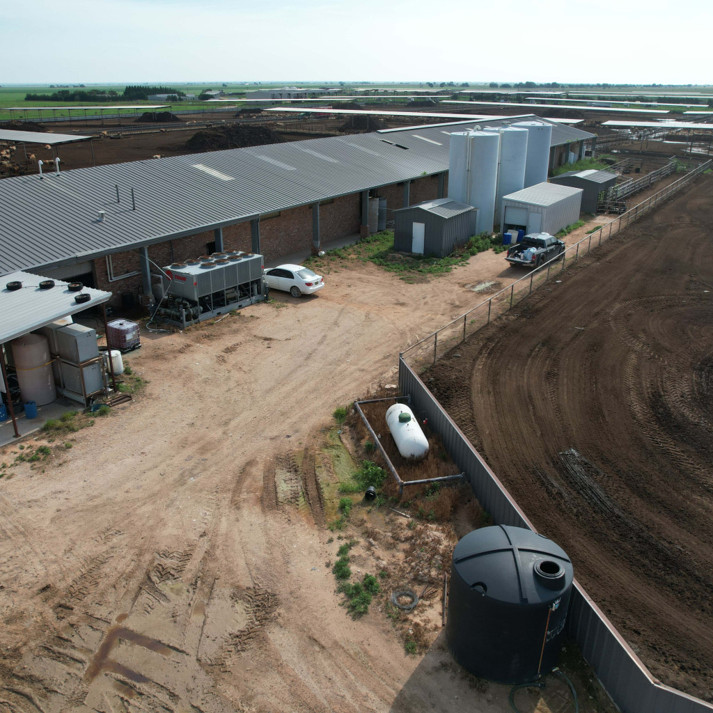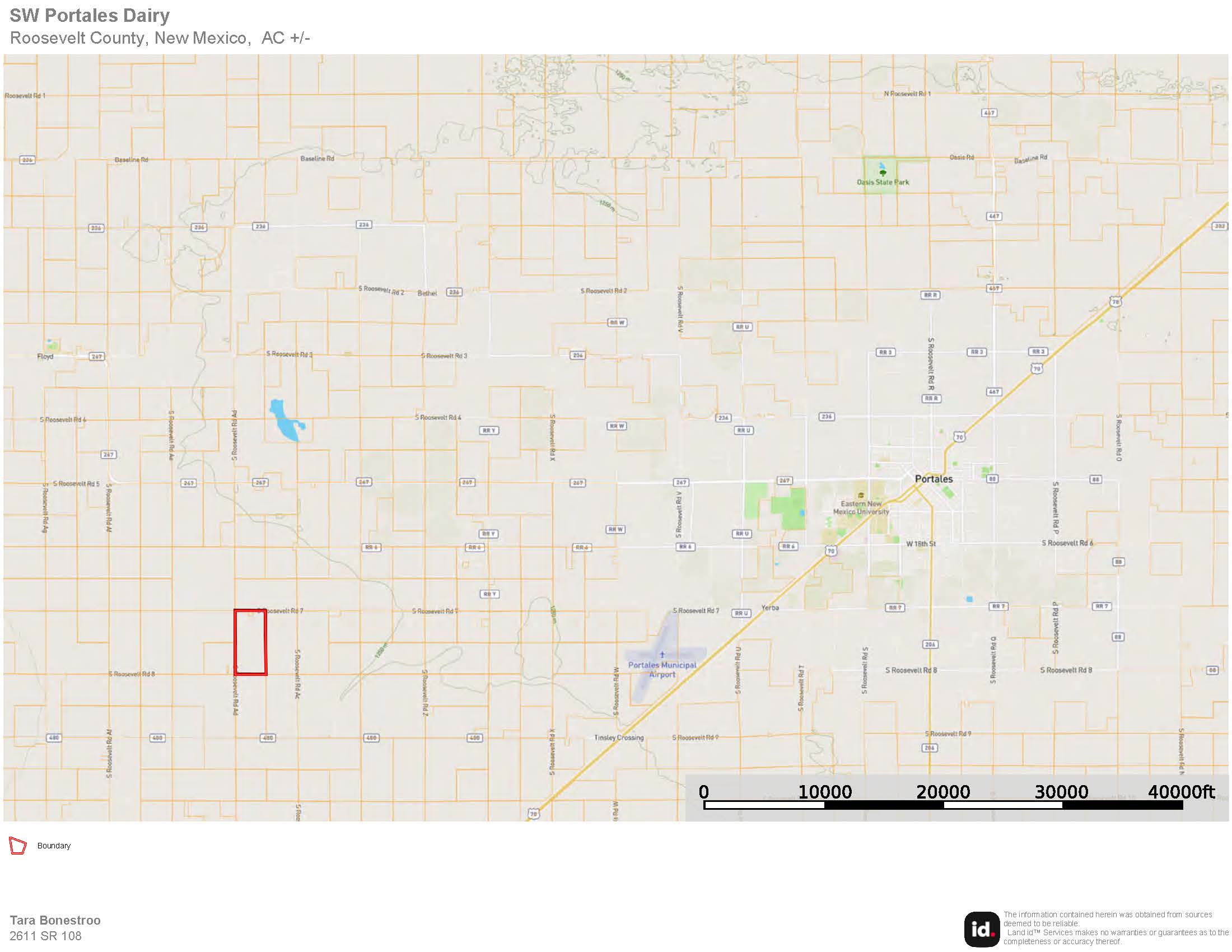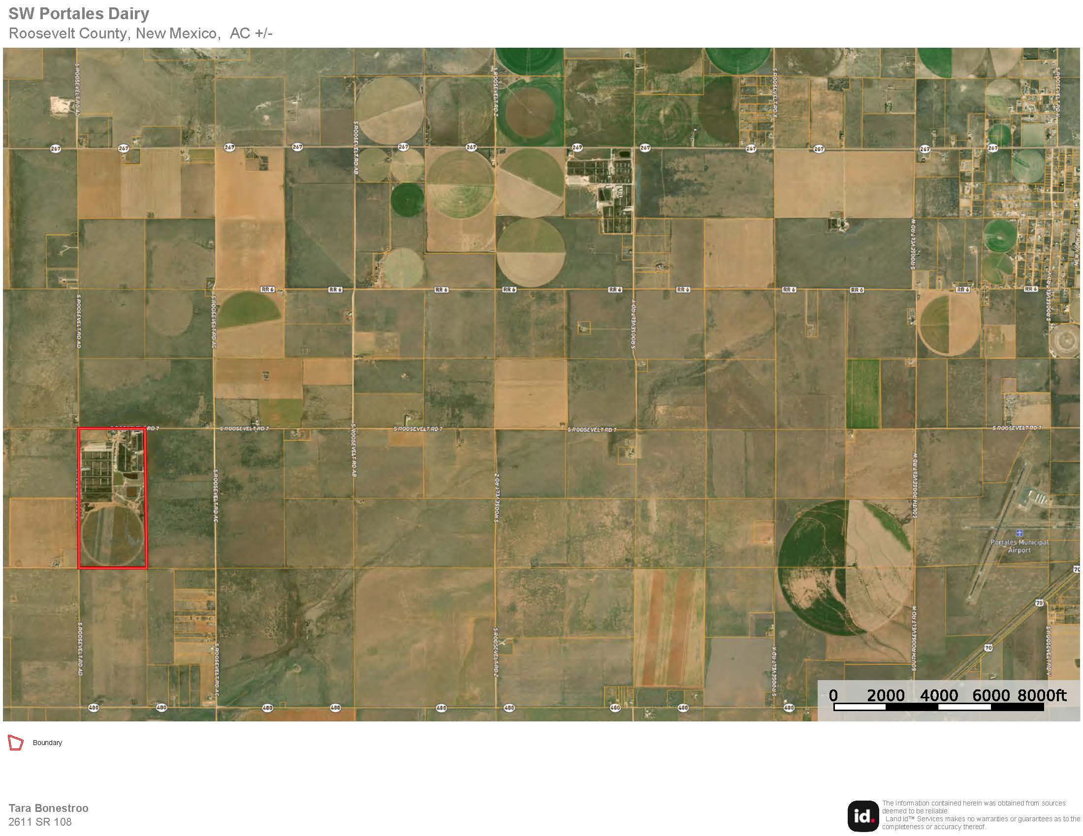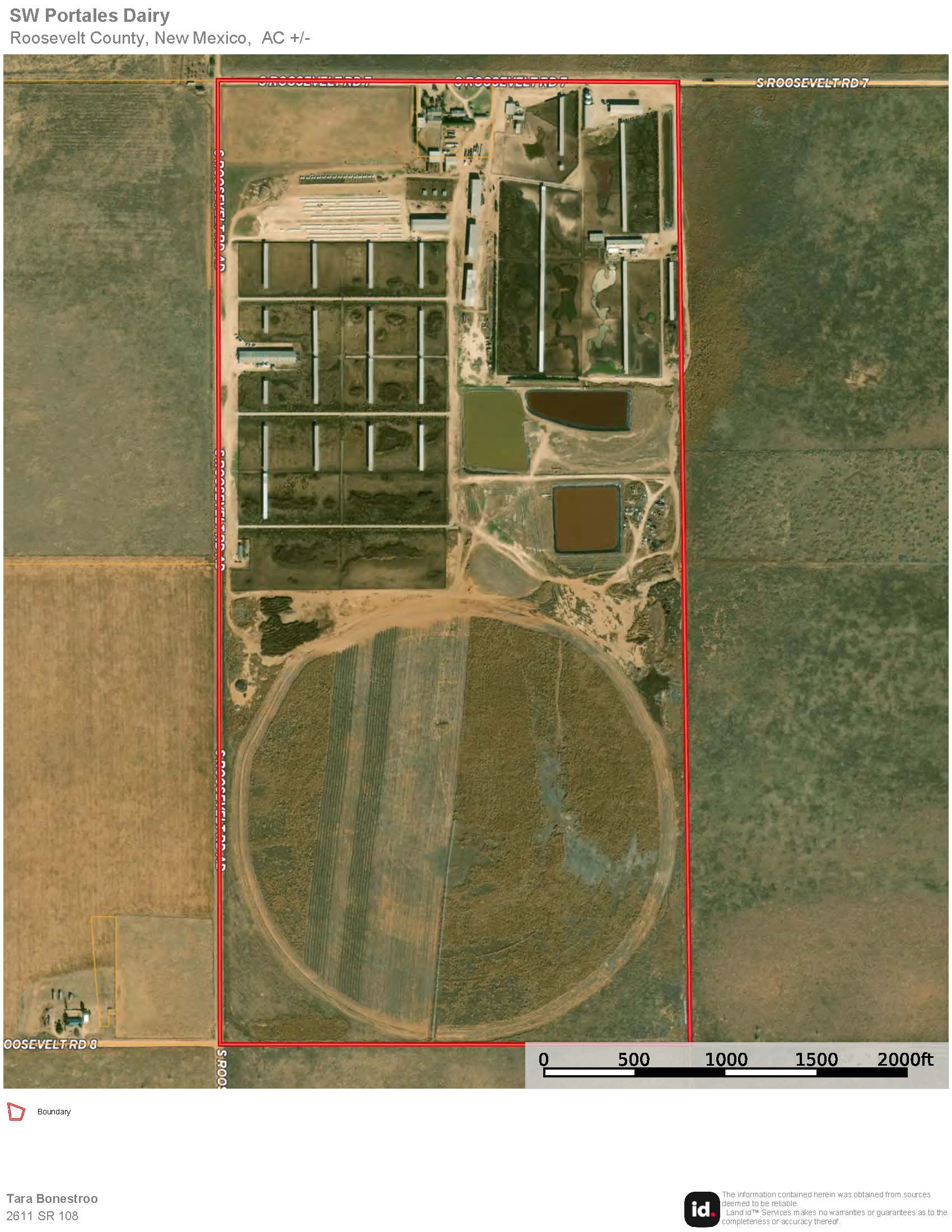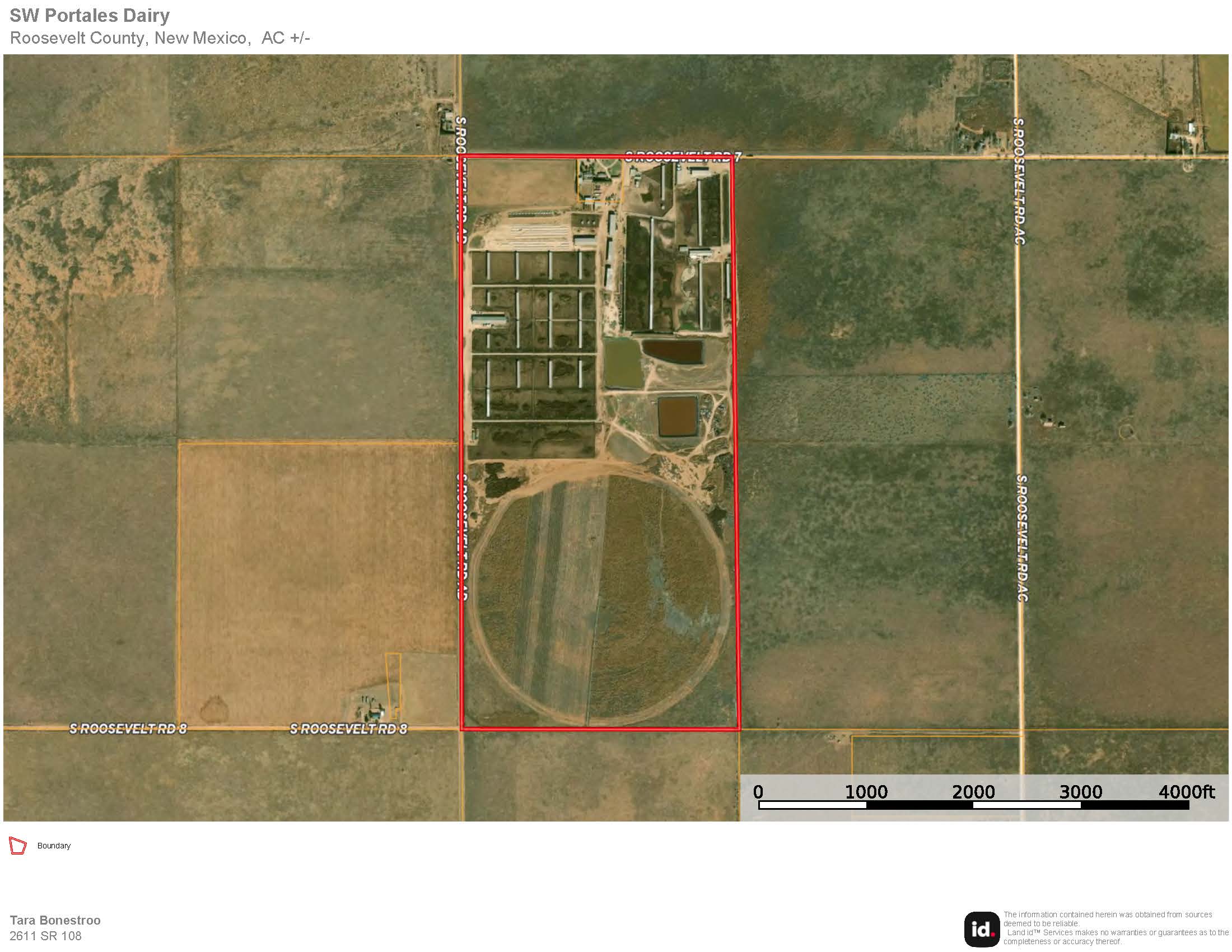 West from Portales on Hwy 267 towards Floyd. Turn back south on S Roosevelt Road AD. Drive one mile and the dairy property begins on the East side of S RR AD.